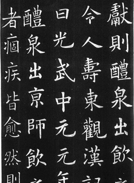 《九成宫醴泉铭》 唐代碑刻,楷书。镌立于632年,由魏徵撰文,欧阳询正书。碑文记载了唐太宗在九成宫避暑之事, 乃欧阳询75岁时的得意之作。此碑书法端丽肃穆,神气充腴,有“势如削玉”之称。结构谨严,笔圆体方,寓险绝于平正之中,堪称人书俱老,炉火纯青。其尽得隋碑刚健方正的笔势, 有北朝书风;又得王羲之俊朗之风神,是欧阳询“欧体”的代表,也是中国书法史上熠熠闪光的名作。